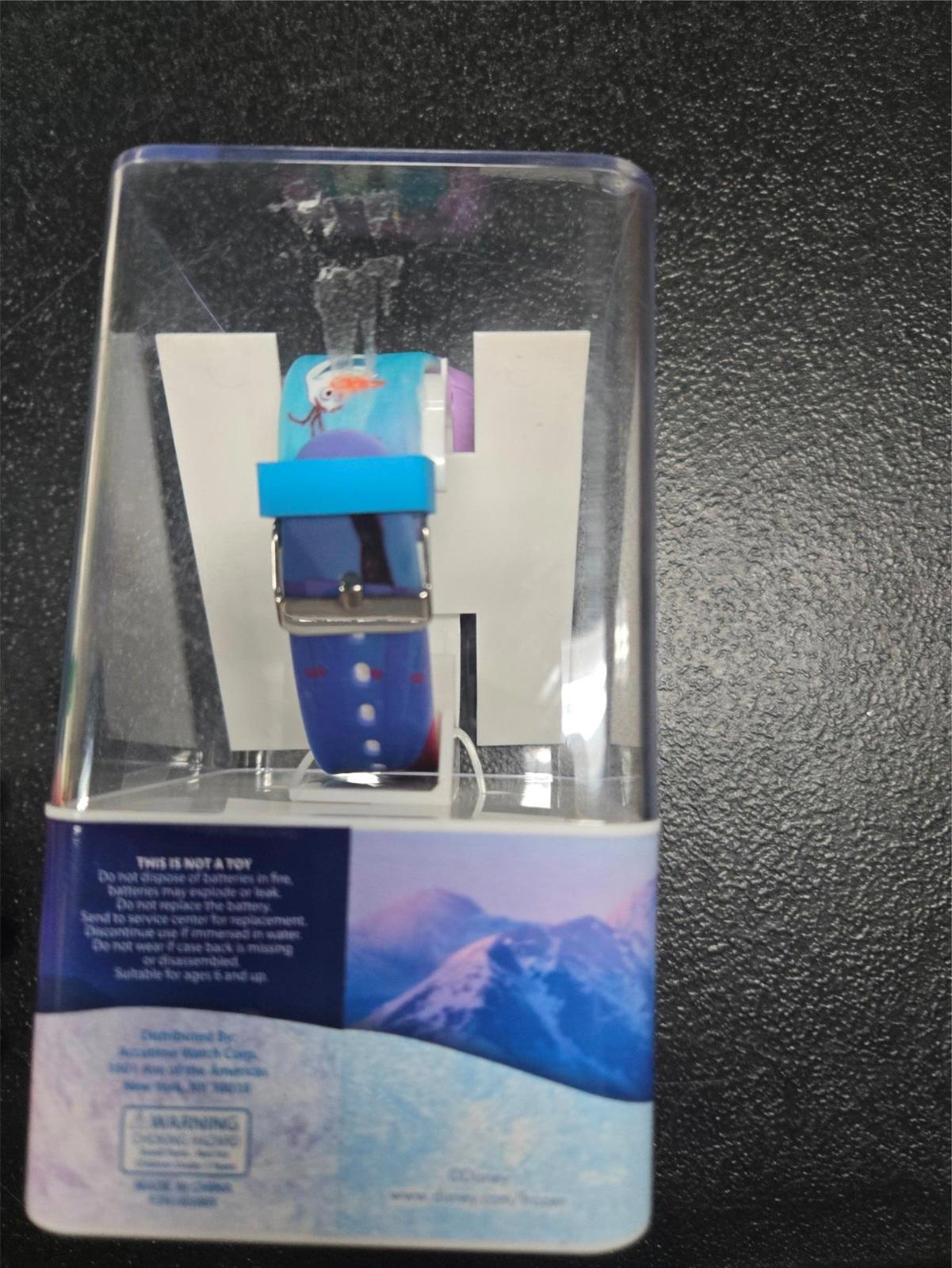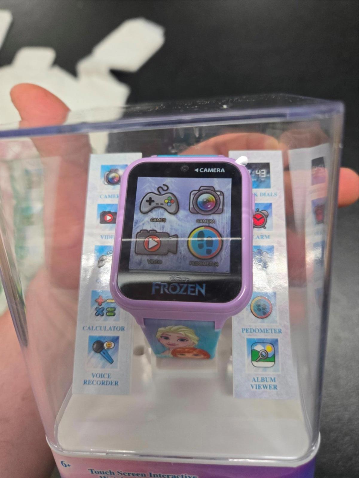 - Frozen-themed kids smartwatch with interactive touchscreen featuring Anna, Elsa, and Olaf. Includes built-in selfie camera and video recorder for capturing fun moments.