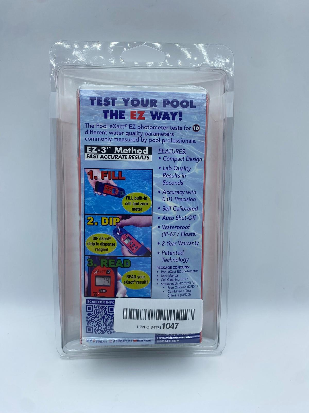- ENTRY KIT: Clamshell includes Pool eXact EZ Photometer, Cleaning Brush, Instruction manual, Individually wrapped reagents (6 tests each; CY reagent sold separately)